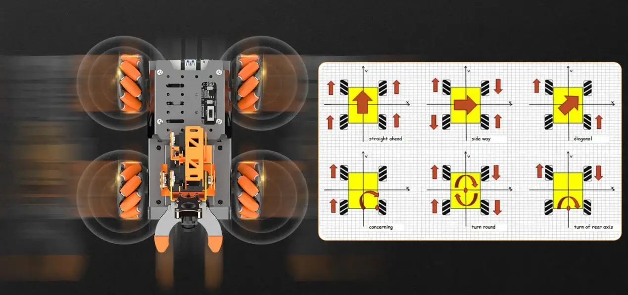 MasterPi được trang bị hệ thống bánh xe mecanum 360° cho phép chuyển động đa hướng, tạo nên sự khác biệt đáng kể trong cách di chuyển của nó. Hệ thống bánh xe này giúp giảm ma sát với bề mặt tiếp xúc, cho phép MasterPi tự do di chuyển theo mọi hướng: tiến, ngang, chéo hay xoay tròn mà không gặp bất kỳ hạn chế nào về hướng.