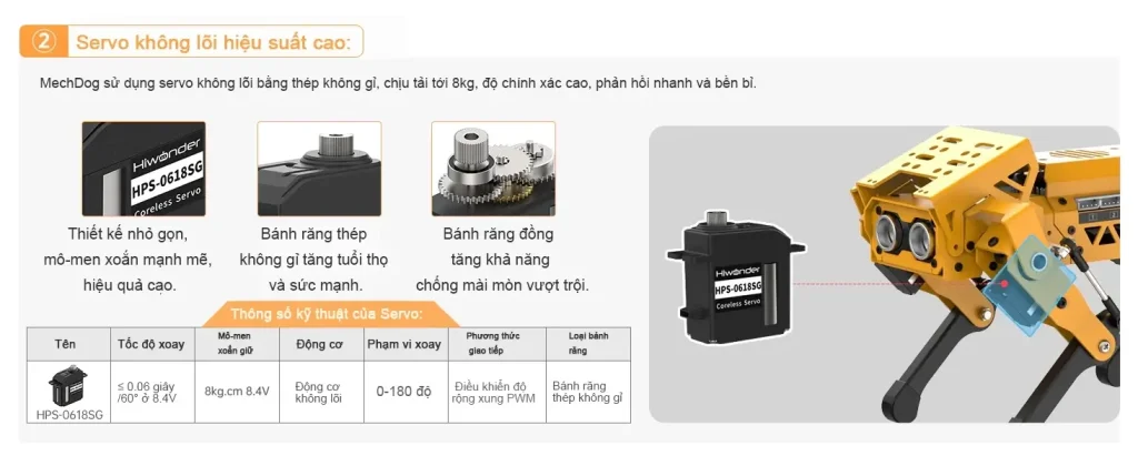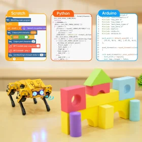 MechDog là một chú chó robot nhỏ gọn nhưng mạnh mẽ, được trang bị bộ điều khiển ESP32 cùng 8 servo lõi không tốc độ cao. Với các thuật toán kinematics ngược tiên tiến, MechDog sở hữu khả năng di chuyển linh hoạt và cực kỳ ấn tượng. Ngoài ra, MechDog còn được tích hợp các cổng mở rộng cho cảm biến siêu âm, cảm biến IMU và nhiều loại cảm biến khác. Chú chó robot này hỗ trợ lập trình bằng Python, Scratch và Arduino, kèm theo nguồn tài liệu học tập và phát triển phong phú, giúp bạn dễ dàng bắt đầu hành trình phát triển robot chó của riêng mình!