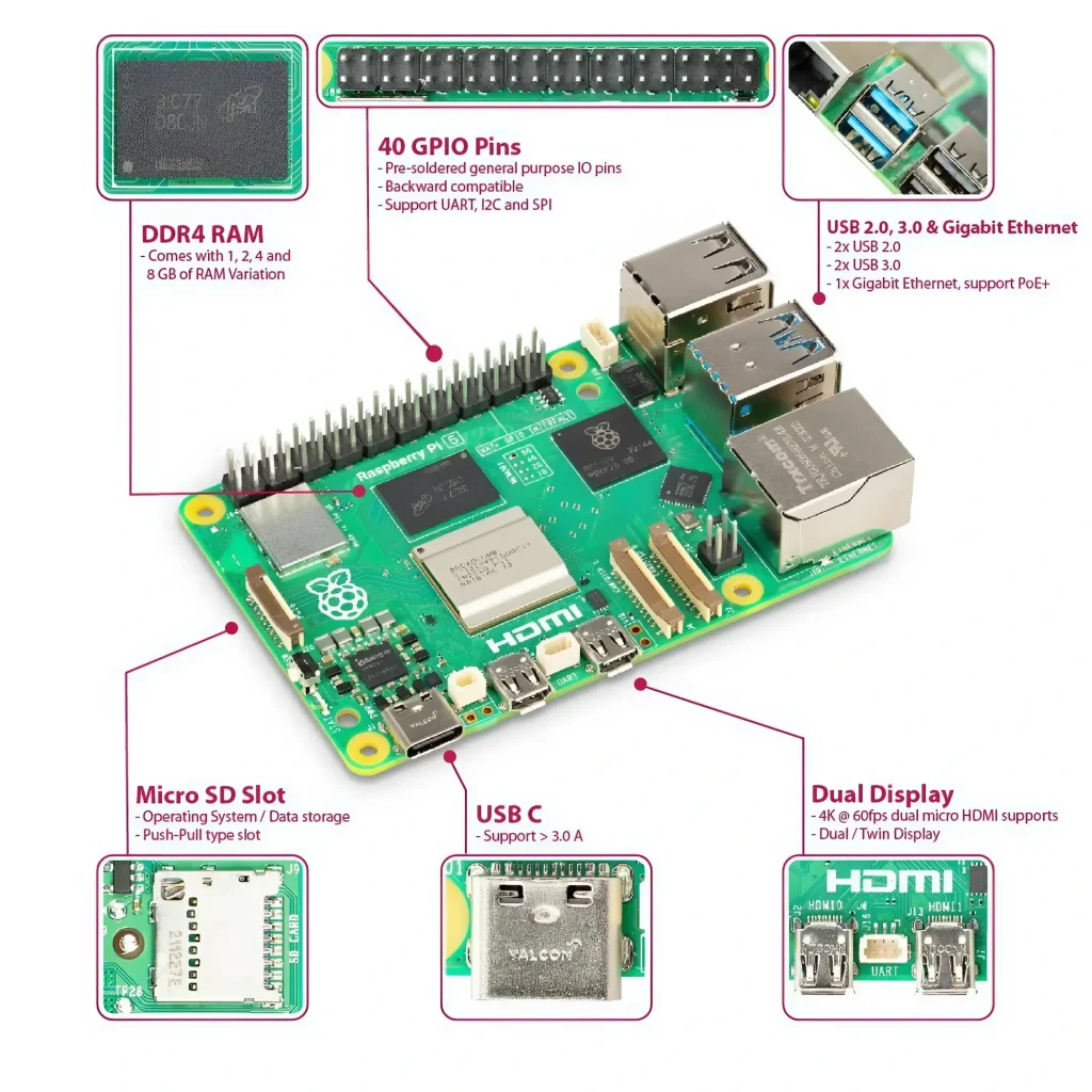 Với 2 cổng HDMI hỗ trợ xuất hình ảnh 4K, USB 3.0 tốc độ cao, PCIe mở rộng cùng nhiều giao tiếp khác, Raspberry Pi 5 đáp ứng linh hoạt mọi nhu cầu học tập, nghiên cứu và phát triển dự án.